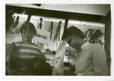 Observam-se dois indivíduos a verificar artigos numa loja de produtos fotográficos não identificada.
