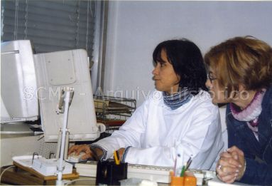 As retratadas, Maria Luísa Guterres Barbosa Colen, técnica superior de arquivo, e Florinda Maria Silva Freire Santos, administrativa, encontram-se sentadas, junto a um posto de trabalho.