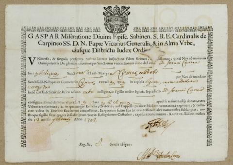 Assinado por Gaspar, bispo de Sabinensis, cardeal de Carpineo, vigário geral da Santa Sé.