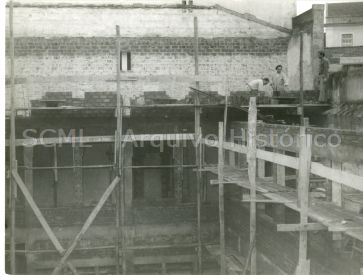 Observam-se, junto à fachada da construção, vários andaimes de madeira, sobre os quais se vislumbram alguns operários a trabalhar.
