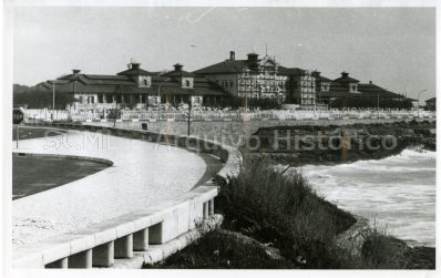 Enquadramento sobre toda a extensão do edifício, parte da passeio da estrada conhecida como "marginal" e zona costeira, à beira rio.