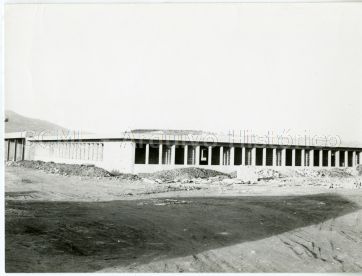Enquadramento de parte do edifício em construção, destacando-se os alicerces e o desenho das fachadas.