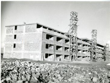 Enquadramento de parte do edifício em construção, destacando-se os alicerces e o desenho das fachadas.