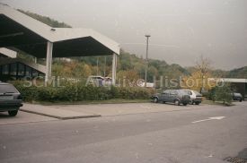 Observa-se uma estrada de alcatrão, destacando-se, em segundo plano, alguns carros estacionados junto a uma estrutura coberta.