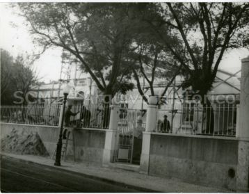 Destacam-se, em primeiro plano, sob o muro de delimitação da zona do edifício, junto ao passeio público, vários operários a trabalhar.