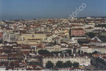 Observam-se, em primeiro plano, as fachadas e telhados de vários edifícios da parte sul de Lisboa.
